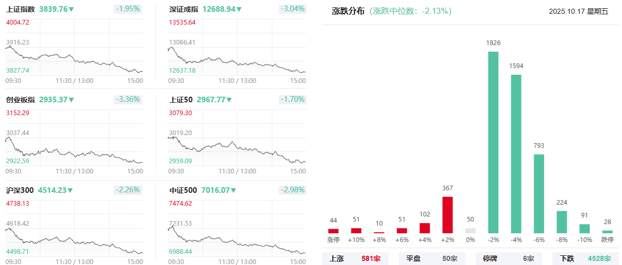 板块概念方面,福建本地股、贵金属、燃气、民航机场等板块逆势走强,电网设备、半导体芯片、光伏风电、核聚变等方向跌幅居前。沪深两市10月17日成交额1.94万亿,较上个交易日放量69亿。