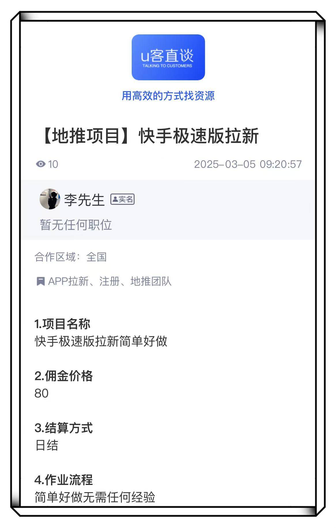 通过邀请新用户安装使用自己推广的app应用软件,获取可观的佣金收益。据U客直谈显示,app拉新佣金大概在30-50一单,一天邀请10名新用户,就有希望在微信上日赚500,何乐而不为呢?