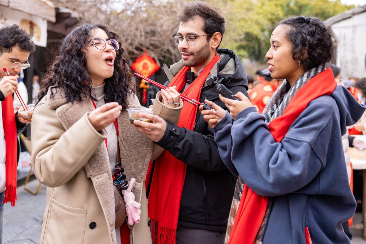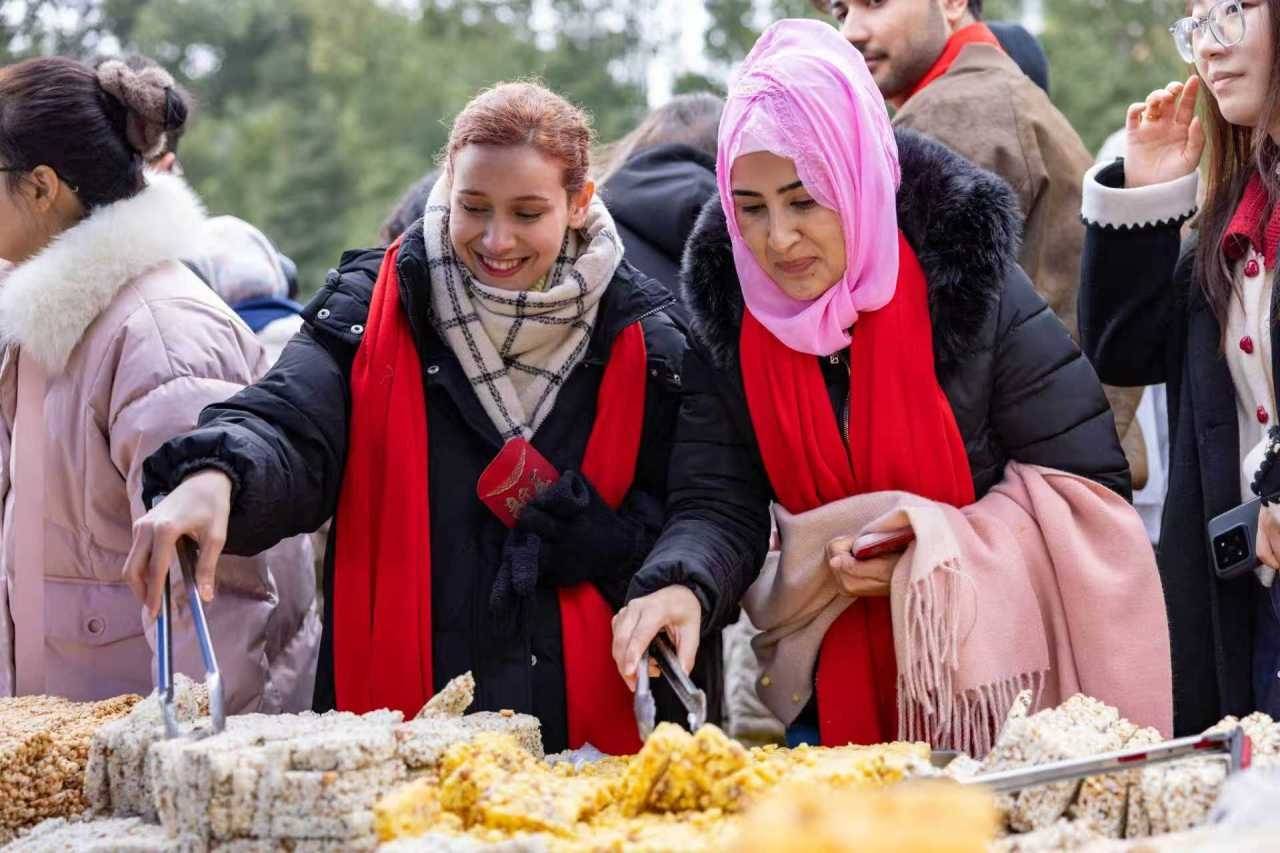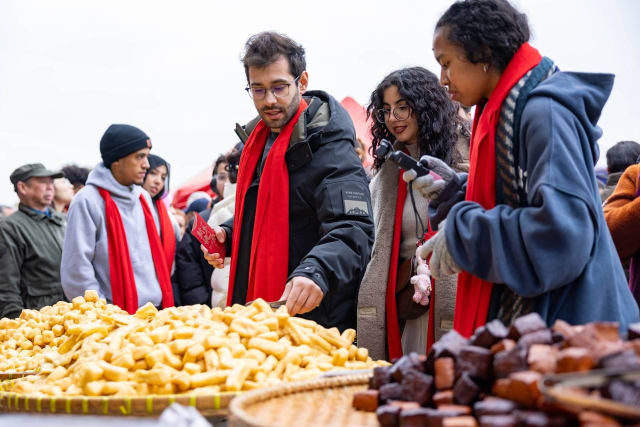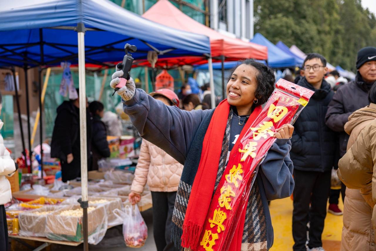 集市上汇聚了年节民俗用品、特色美食、新鲜蔬果、坚果炒货、日用百货等400多个摊位,留学生们融入人流,兴致勃勃地询价、挑选、品尝。在一处售卖核桃、香榧等炒货的摊位前,攻读工商管理的蒙古留学生悠珍(中文名)指着开心果兴奋地说:“我要买这个!小时候妈妈常从新疆带开心果回来,那是我最喜欢的零食。”