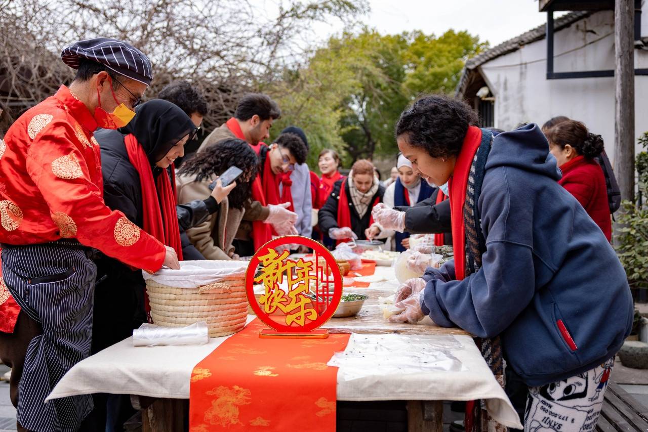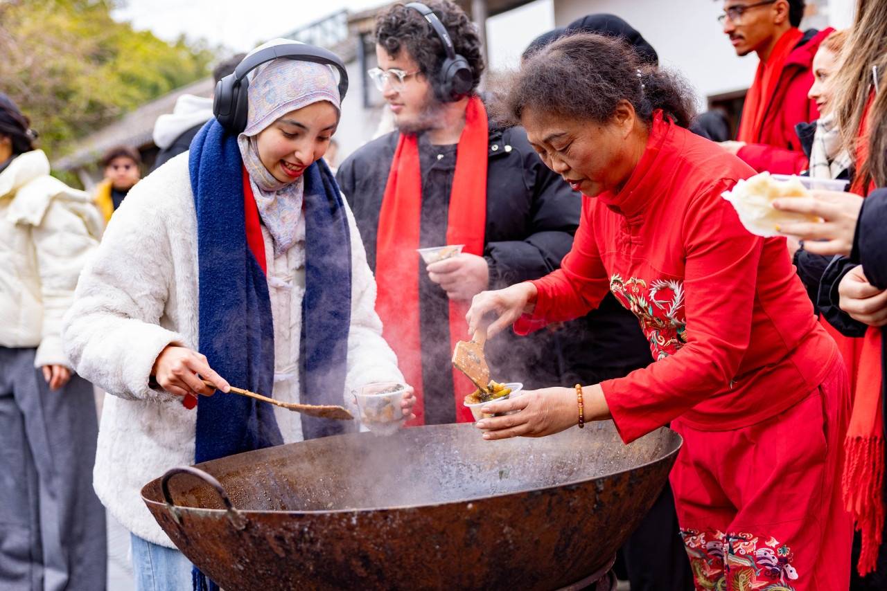 他们是宁波大学的15名留学生,来自蒙古、法国、摩洛哥等国,当天组成了一支“老街寻味团”,在“老街”文化推介员的带领下,走进庄桥老街的“周三集市”与沐青轩青瓷文化园,通过自主探索,零距离体验赶集采购、感受非遗年俗、品尝传统年味,在鲜活的生活场景中触摸中国地道的“老底子”年俗。