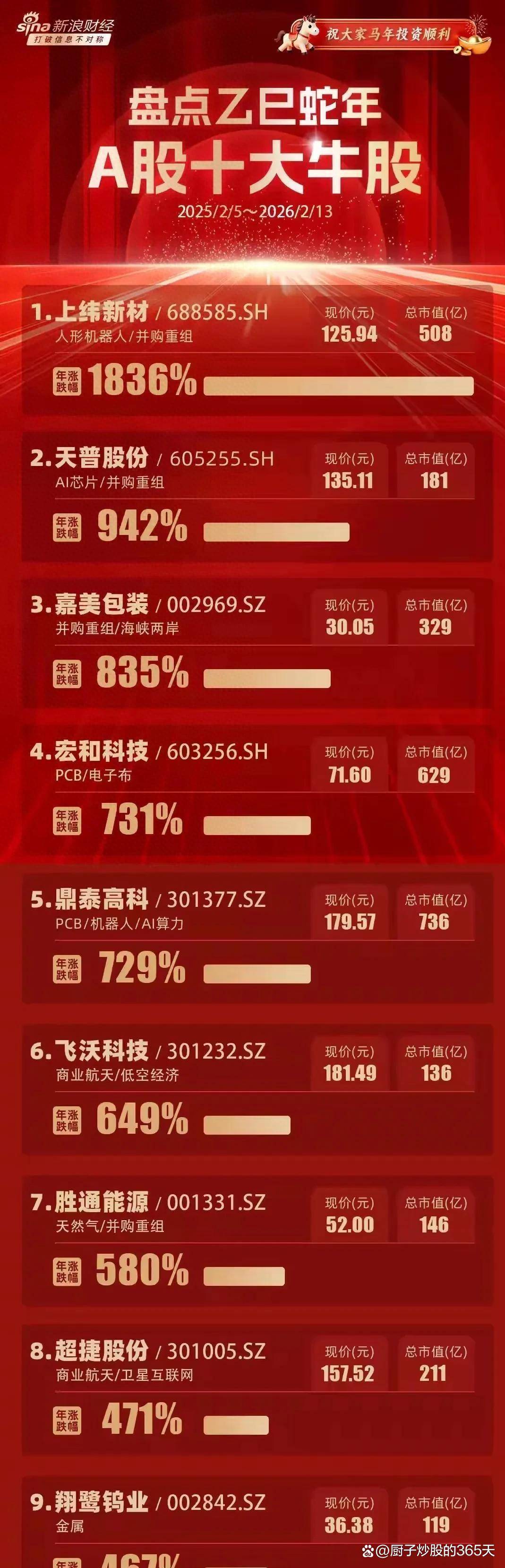 据上海证券报等权威媒体统计,剔除当年上市的新股后,蛇年涨幅排名前十的个股正式出炉。令人咋舌的是,这十只股票在一年内涨幅均超过了460%,平均涨幅之高令人惊叹。它们依次是:超捷股份、胜通能源、ST宇顺、飞沃科技、鼎泰高科、宏和科技、ST亚振、嘉美包装、天普股份以及涨幅冠军上纬新材。
