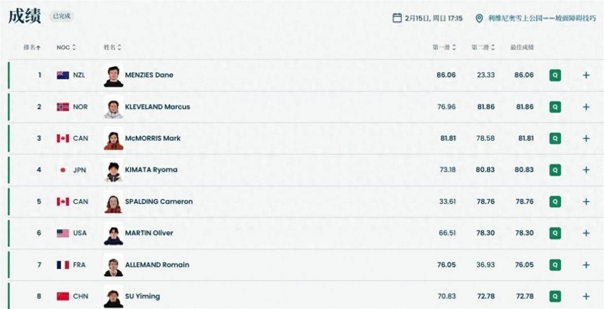 本场预赛的竞争异常激烈。新西兰选手戴恩·门齐斯凭借第一轮滑出的86.06分,稳居预赛头名。挪威老将马库斯·克利夫兰在第二轮将个人最高分提升至81.86分,位列第二。曾连续三届冬奥会摘得该项目铜牌的加拿大名将马克·麦克莫里斯,以81.81分排名第三。日本选手木俣椋线分,成为本场比赛第四位得分超过80分的选手。最终晋级决赛的12名选手,分数从第一名的新西兰选手86.06分,到第12名的挪威选手蒙斯·罗的69.63分,差距并不算大,每一分都体现了细节上的极致追求。