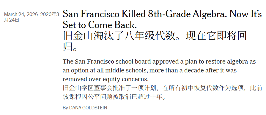 最近,美国K -12圈有个挺大的新闻是旧金山学区恢复了八年级学生的代数课。