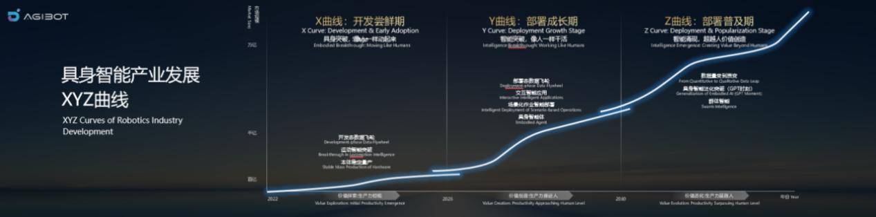 第一个阶段是2022年至2025年,为X曲线,具身智能从实验室概念变为能动起来的机器人,其核心是“具身”,对智元来说,在2023年成立,并在当年发布了首款人形机器人远征A1,完成技术可行性验证,2025年完成5000台量产。
