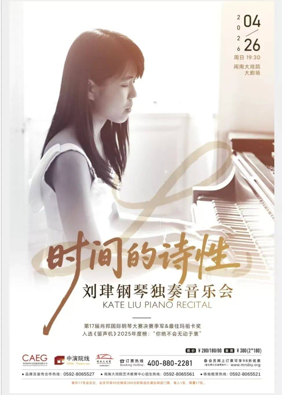 她曾在聚光灯下让整个华沙屏住呼吸,2015年第17届肖邦国际钢琴大赛决赛现场,她作为唯一闯入决赛的女性钢琴家拿下三等奖和最佳玛祖卡奖以及由波兰国家广播电台听众票选的最受观众喜爱奖,她就是刘珒(Kate Liu)。她将首度亮相闽南大戏院,带来“时间的诗性”刘珒(Kate Liu)钢琴独奏音乐会,从肖邦出发穿越舒曼,再到勃拉姆斯,在黑白琴键之间开启一段对时间和记忆的回望,探入十九世纪浪漫主义的音乐图谱。