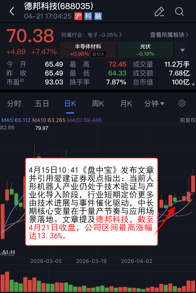 4月15日10:41《盘中宝》 发布文章并引用爱建证券观点指出:当前人形机器人产业仍处于技术验证与产业化导入阶段,行业短期定价更多由技术进展与事件催化驱动,中长期核心变量在于量产节奏与应用场景落地。文章提及德邦科技,截至4月21日收盘,公司区间最高涨幅达13.36%。