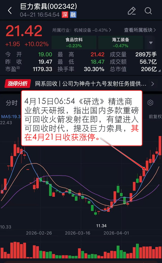 4月15日06:54《研选》 精选商业航天研报,指出国内多款重磅可回收火箭发射在即,有望进入可回收时代,提及巨力索具。
