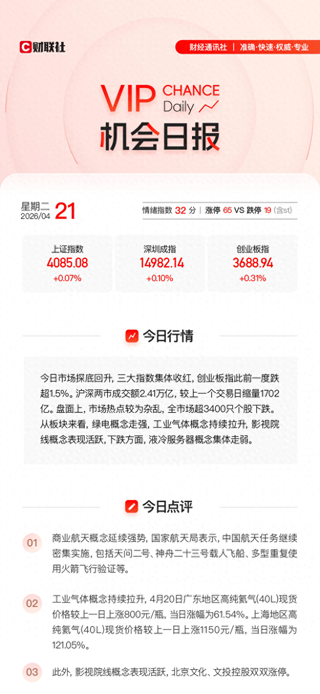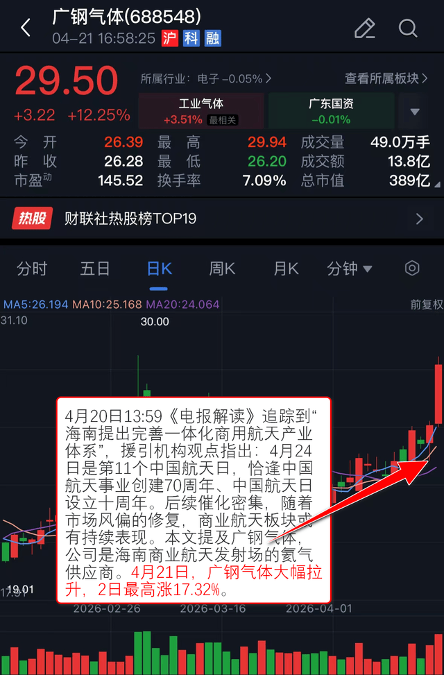 4月20日13:59《电报解读》 追踪到“海南提出完善一体化商用航天产业体系”,援引机构观点指出:4月24日是第11个中国航天日,恰逢中国航天事业创建70周年、中国航天日设立十周年。后续催化密集,随着市场风偏的修复,商业航天板块或有持续表现。本文提及广钢气体,公司是海南商业航天发射场的氦气供应商。4月21日,广钢气体大幅拉升,2日最高涨17.32%。