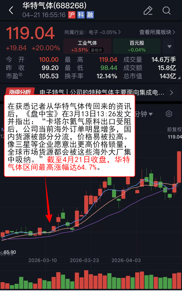 在获悉记者从华特气体传回来的资讯后,《盘中宝》在3月13日13:26发文并指出:“卡塔尔氦气原料出口受阻后,公司当前海外订单明显增多,国内货源被部分分流,价格易被拉高。像三星等企业愿意出更高价格锁量,全球市场货源都会被这些海外大厂集中吸纳。”截至4月21日收盘,华特气体区间最高涨幅达64.7%。