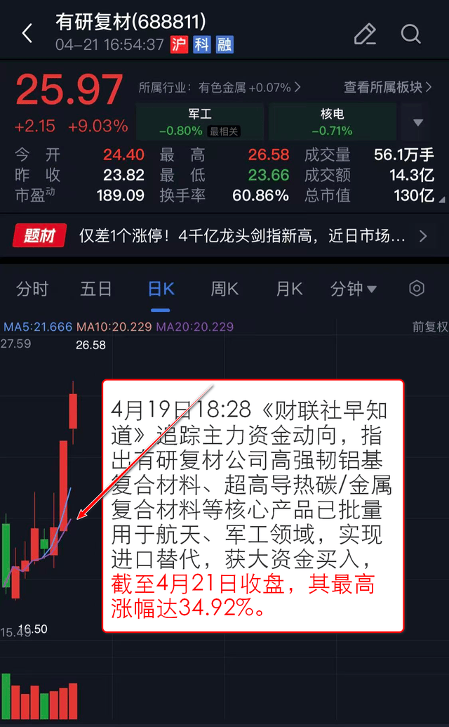 4月19日18:28《财联社早知道》 追踪主力资金动向,指出有研复材公司高强韧铝基复合材料、超高导热碳/金属复合材料等核心产品已批量用于航天、军工领域,实现进口替代,获大资金买入,截至4月21日收盘,其最高涨幅达34.92%。
