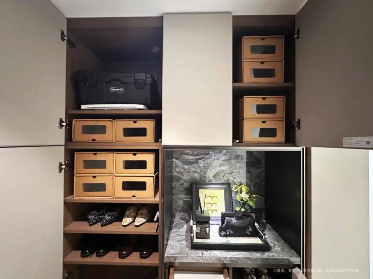 ,设置大量挂衣区与双面柜体,实现空间翻倍;主卫镜柜分层设计搭配分隔盒收纳护肤品,地柜采用抽屉式设计并内置防水收纳盒,分类存放清洁用品,细节满满。