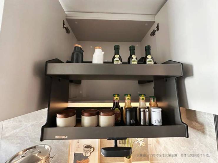 ,嵌入电器的同时,通过透明密封罐统一收纳干货杂粮并贴标存放于拉篮内,容量充足可叠放约8个山姆款家庭装零食大礼包;并将备餐区下方的抽屉升级,配置碗碟拉篮、分区调味拉篮,实现 “一拉到位、一目了然”,可满足6-8人份碗筷收纳需求,吊柜搭配升降拉篮解决高处取物难题。