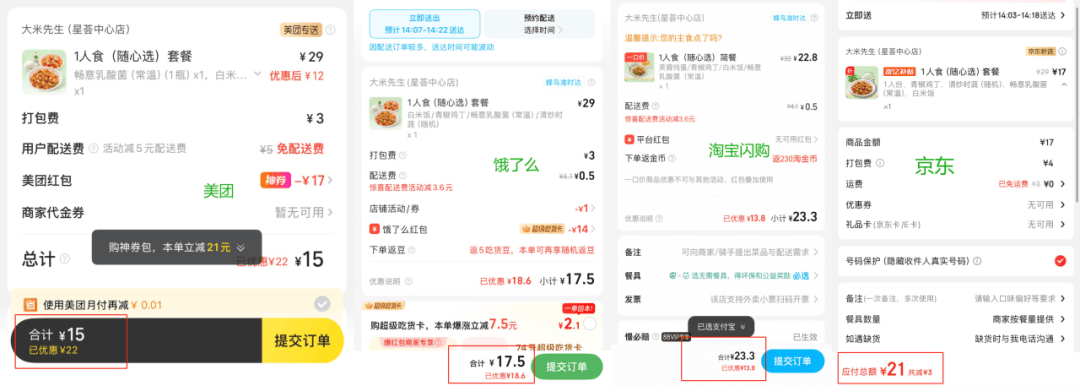 但到了9月底,京东的价格优势已不复存在。9月29日,《IT时报》记者实测,点同样一份套餐,叠加各种优惠券和平台自带补贴后,美团售价18元,京东21元,淘宝闪购17.5元,而最便宜的竟是大众点评于9月10日重启的“品质外卖”服务,叠券后仅需15元。
