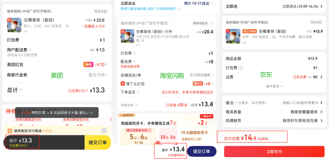 一杯瑞幸咖啡的价格也逐渐趋同:美团13.3元、淘宝闪购13.4元、京东14.9元。
