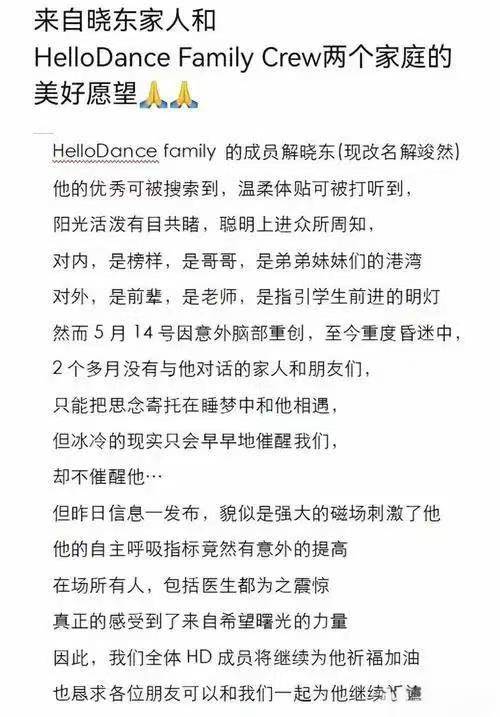 去年五月,解晓东在舞房里不慎摔倒,后脑勺重重撞地,导致重型颅脑损伤,瞬间昏迷。这一摔改变了他的一生。尽管他多年来身体一直保持得很好,舞蹈动作也总是标准精准,但这次意外让他的人生轨迹发生了巨大的偏移。街舞看起来非常酷,但背后却是无数次的摔倒与重生,即便身体素质再好,也有撑不住的时候。送到医院后,他一直昏迷,手术虽然进行了,但最终未能挽回他的生命。