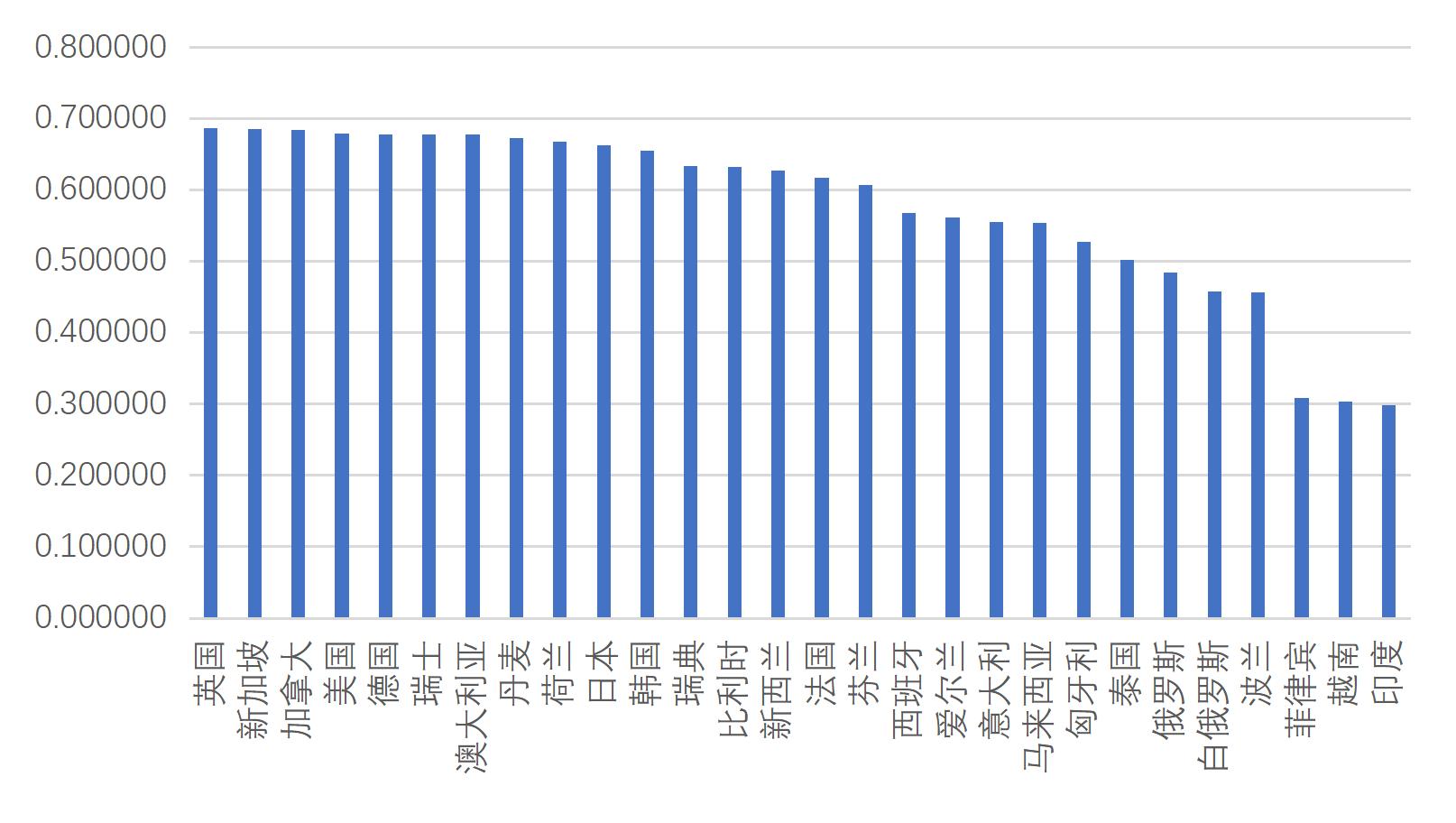 就信任与开放指标而言,28个国家得分排序依次为:白俄罗斯、韩国、马来西亚、俄罗斯、新加坡、日本、新西兰、泰国、美国、丹麦、西班牙、澳大利亚、爱尔兰、匈牙利、英国、意大利、比利时、法国、加拿大、芬兰、波兰、越南、瑞典、德国、瑞士、荷兰、菲律宾、印度。