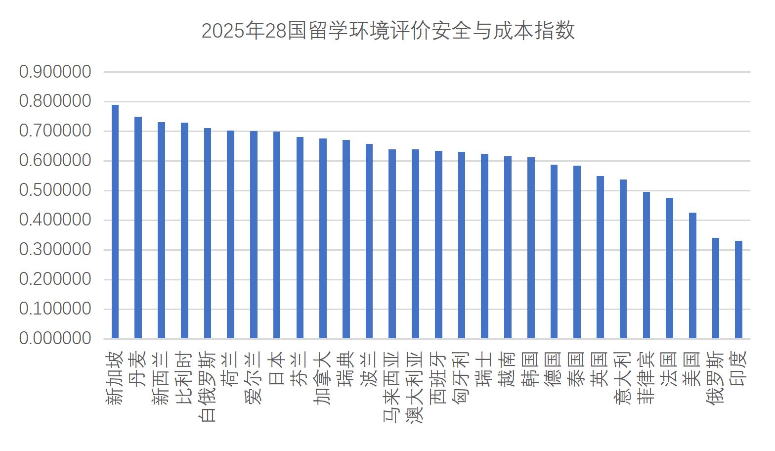 经评估分析,28个国家留学环境综合评估得分排序依次为:英国、新加坡、加拿大、美国、德国、瑞士、澳大利亚、丹麦、荷兰、日本、韩国、瑞典、比利时、新西兰、法国、芬兰、西班牙、爱尔兰、意大利、马来西亚、匈牙利、泰国、俄罗斯、白俄罗斯、波兰、菲律宾、越南、印度。
