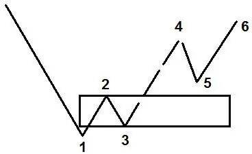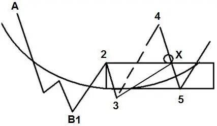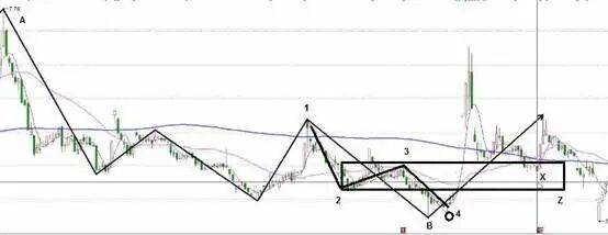 如上图所示,我们在画转折中枢的时候,到底应该如何去倒推前三段。我们可知的是AB为下跌线的时候,我们应该怎么倒推呢?很简单,这时候我们就不能以AB段为前三段。而是在按照同级别分解,从位置三直接到位置X画一条线段。所以,它的中枢就是12,三X。